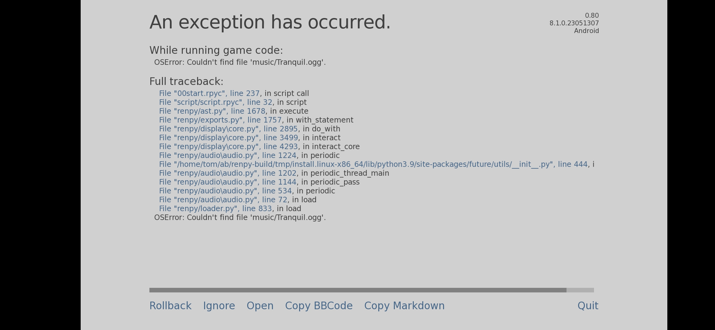 Trying to play the game on android. I installed the apk after extracting the zip, but when I tap to launch, it just gives me the champion of realm image with the tub. I've left it on there for a while and it doesn't move on or give me an error screen. I've tried copying the game folder into place but I still get it stuck on that image.